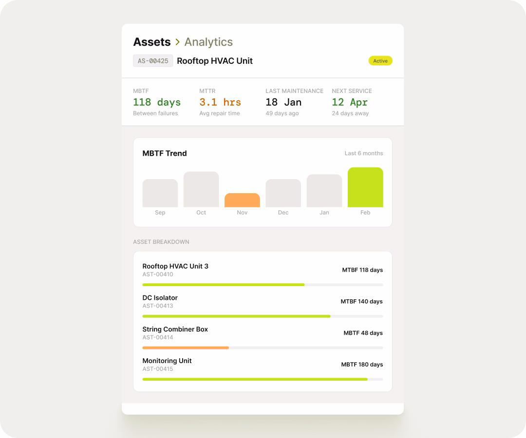 Each asset carries its own live analytics such as MTBF, MTTR, last service date, next scheduled maintenance. It's not a report you run periodically; it's a real-time view that's always current. Useful for spotting which assets are costing you disproportionate time and money before the pattern gets expensive.